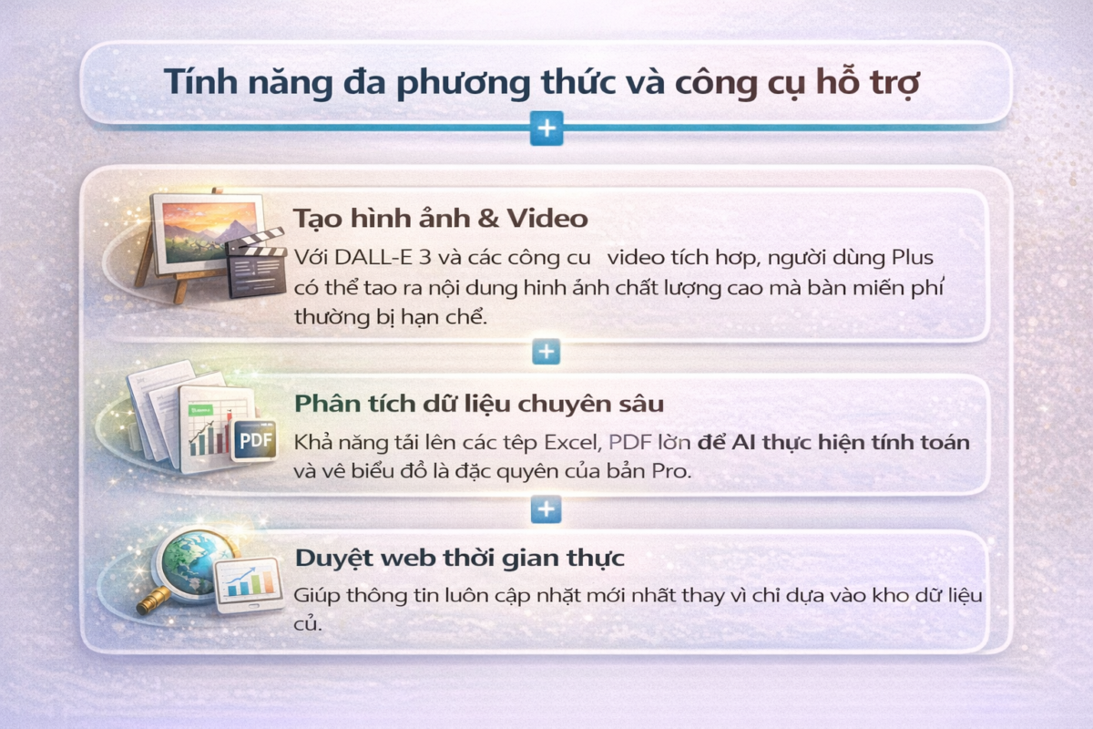 - Tạo hình ảnh & Video: Với DALL-E 3 và các công cụ video tích hợp, người dùng Plus có thể tạo ra nội dung hình ảnh chất lượng cao mà bản miễn phí thường bị hạn chế.