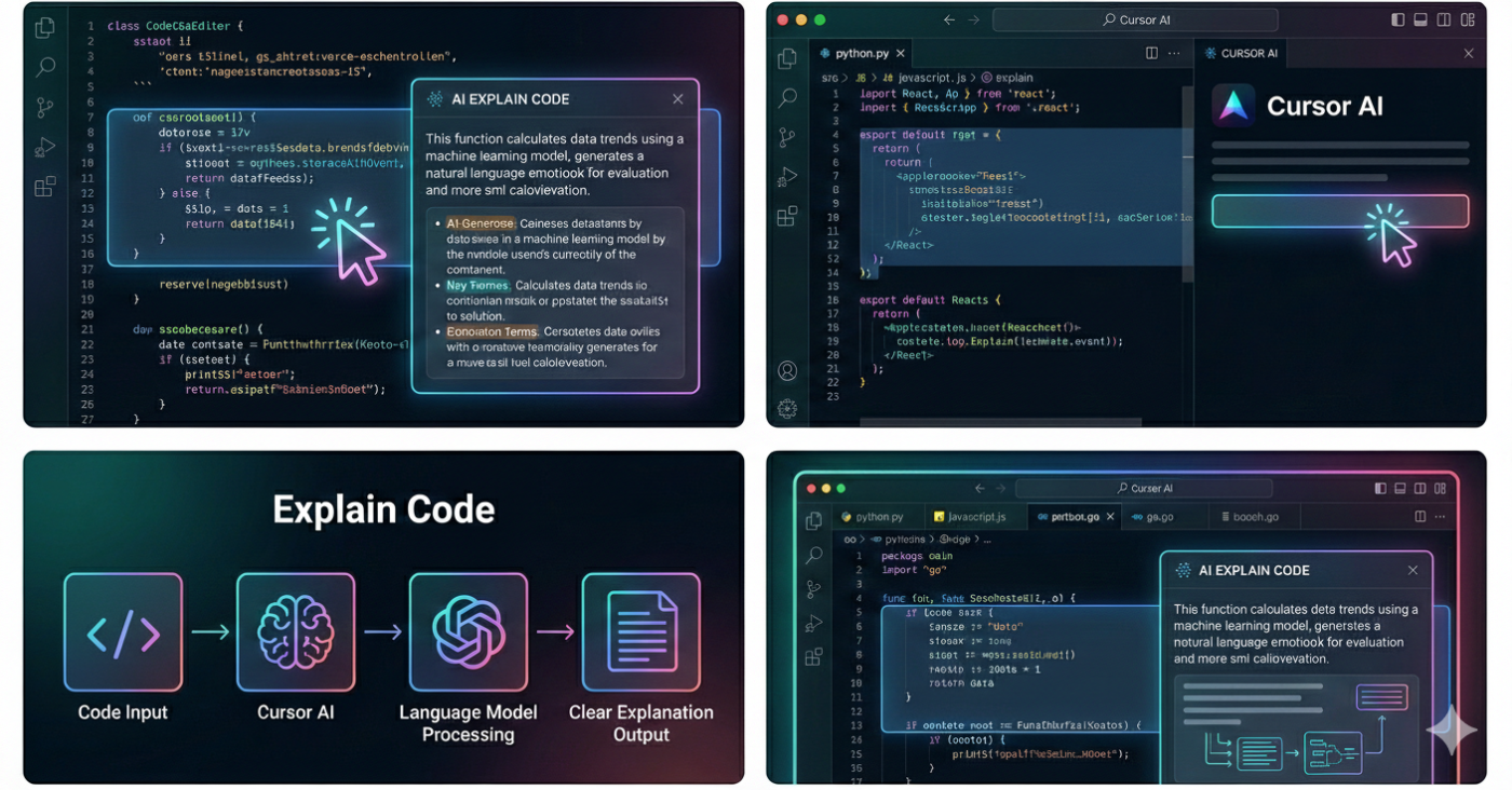 thì Explain Code của Cursor AI là tính năng cực kỳ đáng thử. Nó biến IDE thành một “người hướng dẫn”, giúp bạn từ mơ hồ → hiểu rõ → làm được ngay.