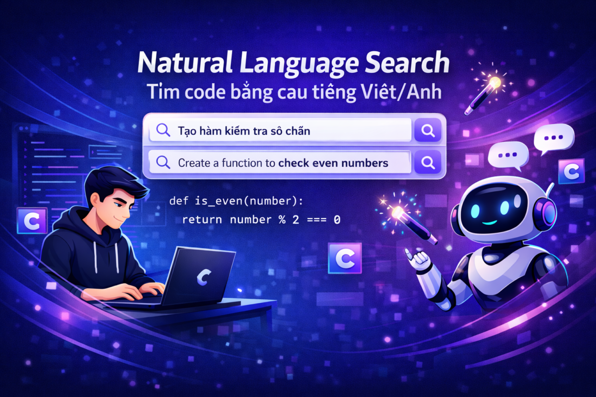 Natural Language Search giúp bạn giải quyết đúng painpoint này. Bạn không cần đoán tên file, tên hàm hay keyword.