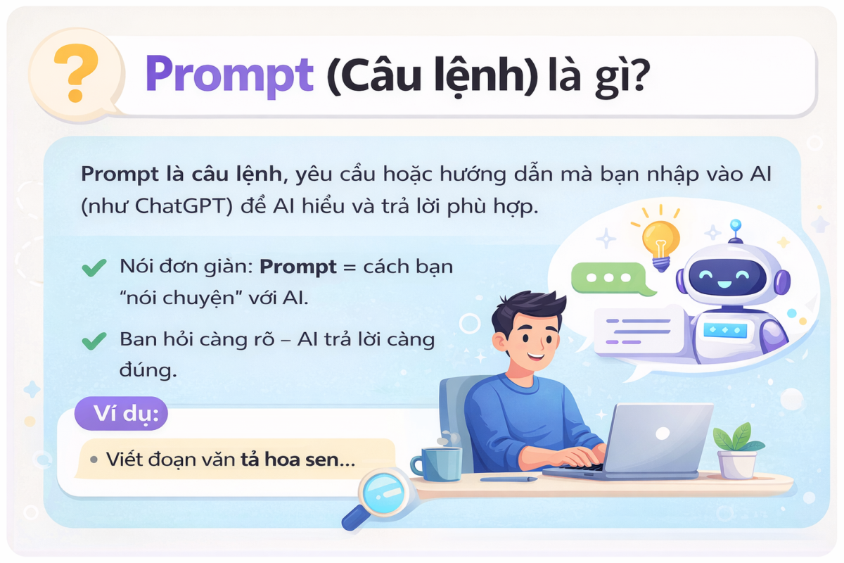 Prompt là câu lệnh, yêu cầu hoặc hướng dẫn mà bạn nhập vào AI (như ChatGPT) để AI hiểu và tạo ra câu trả lời phù hợp.
