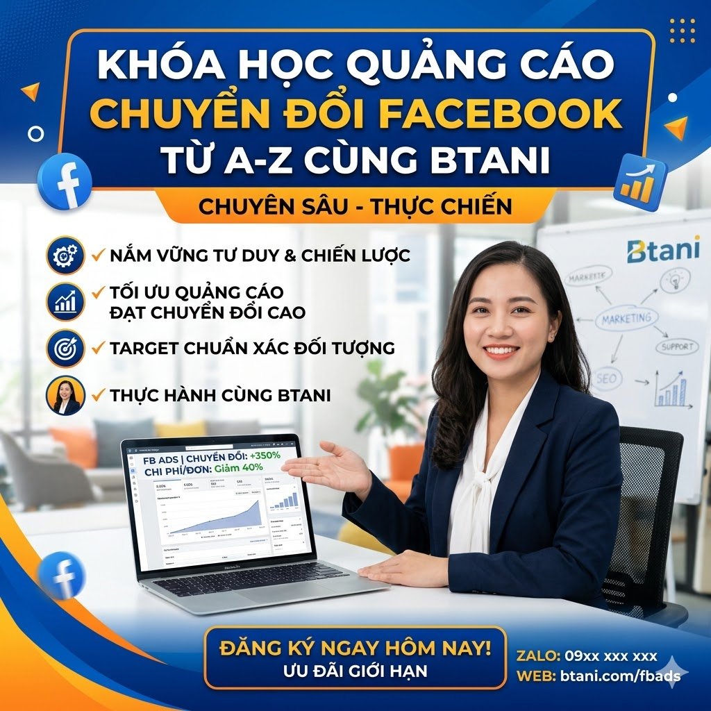 Khóa Học Quảng Cáo Chuyển Đổi Facebook Từ A-Z cùng Btani là lựa chọn phù hợp dành cho những ai muốn nắm vững tư duy chạy quảng cáo Facebook theo mục tiêu chuyển đổi, từ nền tảng cơ bản đến cách tối ưu thực chiến trong quá trình triển khai.