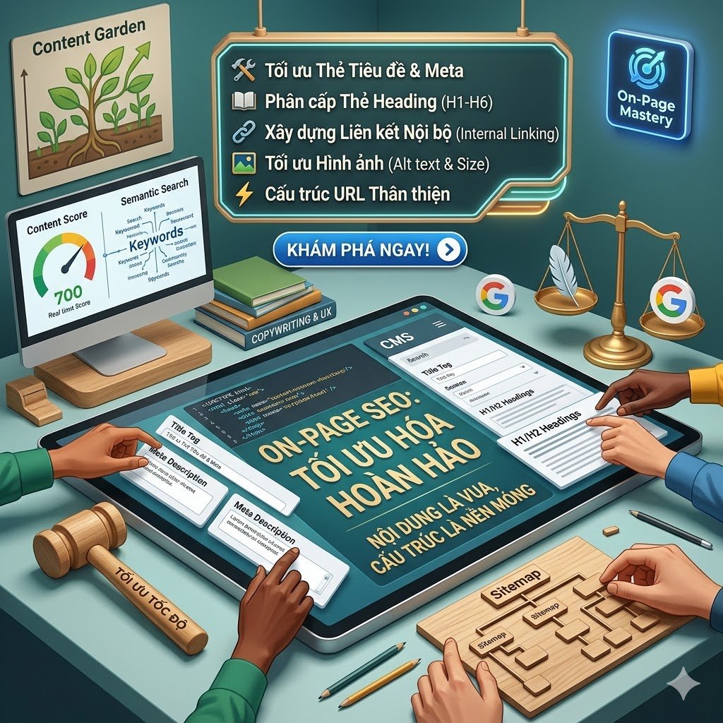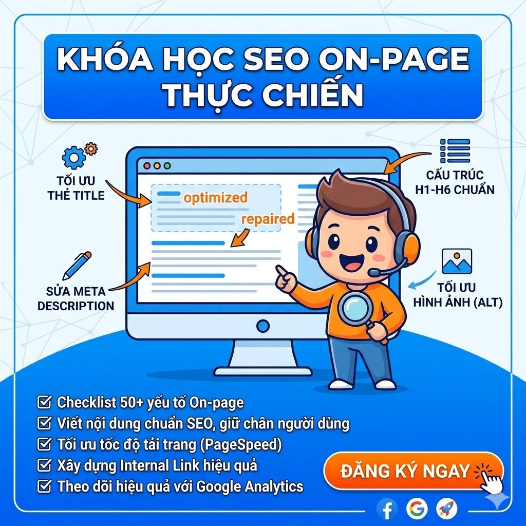 Trong khóa học, bạn sẽ được hướng dẫn chi tiết cách tối ưu từ khóa, thẻ tiêu đề (title), mô tả (meta description), heading, URL và nội dung bài viết chuẩn SEO. Đồng thời, bạn sẽ biết cách tối ưu hình ảnh, internal link, trải nghiệm người dùng và cấu trúc website để giúp Google dễ dàng thu thập và đánh giá cao trang web của bạn.