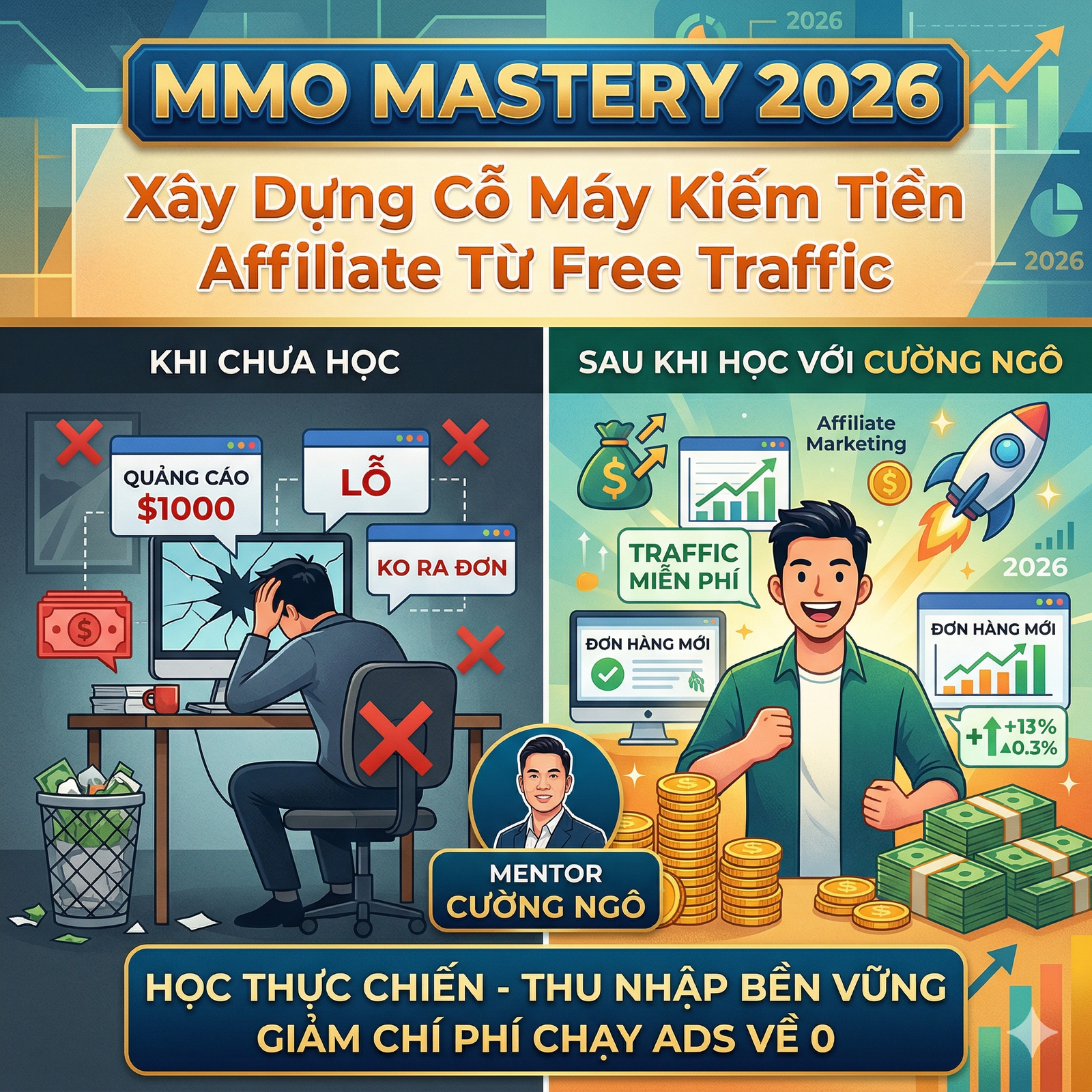 Bạn đã chán nản vì đốt tiền vào quảng cáo mà không ra đơn? Bạn muốn xây dựng một sự nghiệp kiếm tiền online bền vững nhưng không có vốn lớn? Khóa học MMO Mastery 2026 của Mentor Cường Ngô chính là câu trả lời giúp bạn làm chủ kỹ thuật Free Traffic – biến lưu lượng truy cập miễn phí thành dòng tiền thụ động mỗi ngày.