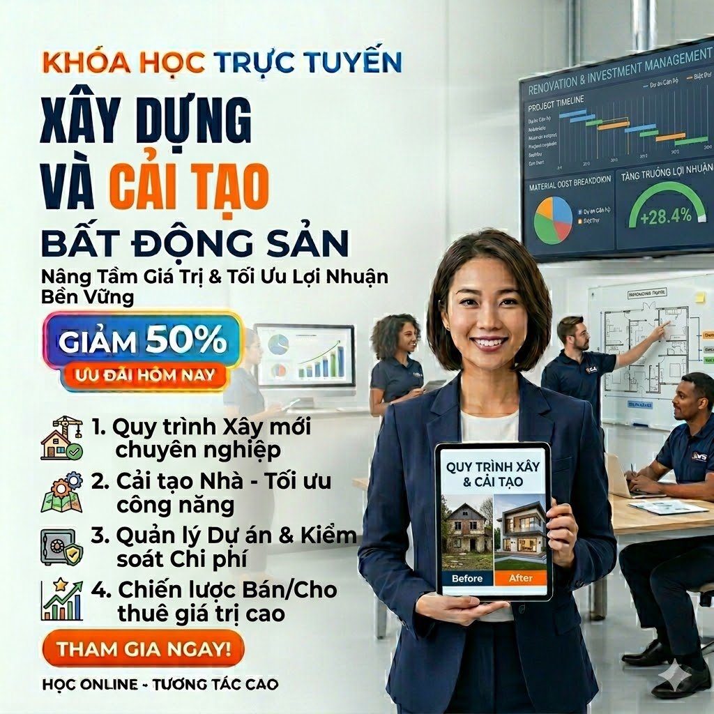 Khóa học Xây Dựng & Cải Tạo Bất Động Sản sẽ giúp bạn nắm vững toàn bộ quy trình từ lên ý tưởng, tối ưu chi phí, đến thi công và khai thác hiệu quả. Đây là kỹ năng “đòn bẩy” giúp nhiều nhà đầu tư biến tài sản bình thường thành nguồn thu nhập vượt trội.